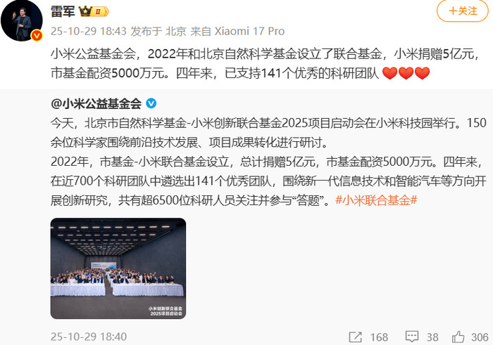 随后,雷军转发该微博:小米公益基金会,2022年和北京自然科学基金设立了联合基金,小米捐赠5亿元,市基金配资5000万元。四年来,已支持141个优秀的科研团队。